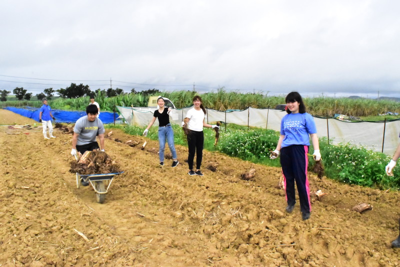 サンゴ礁に悪影響を及ぼす畑からの表土の流出を抑制するため、農地の周囲に月桃や糸芭蕉等の在来植物の植え付け作業をします。